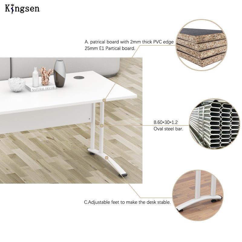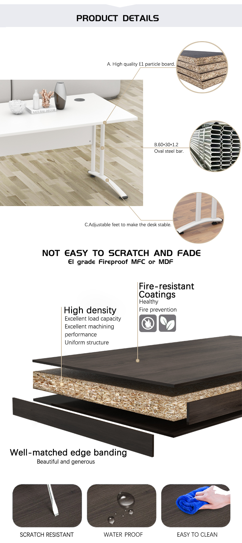1. Top size is 800W*450D*25 in patrical board with 2mm thick PVC edge.    2.“O” shape leg in Dia40 round steel tube.                                                    3.One fixed beams in 40*20 steel tube and two brackets to link the desk top. 4. Adjustable feet under the "O“ shape leg.