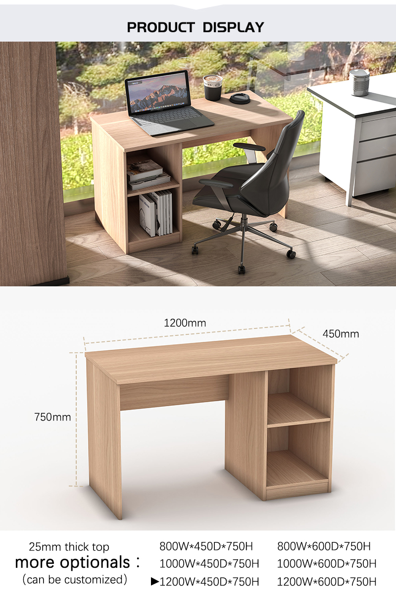 1.Straight Desk in 1200*600*730 (more sizes)                                                2.Desk top size is 1200W*600D*25(more sizes) in partical board with 2mm PVC edge.                                                                                                3.One cable port in the main desk.